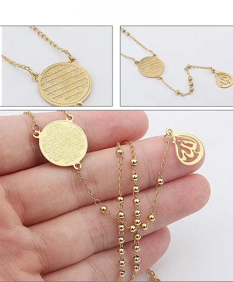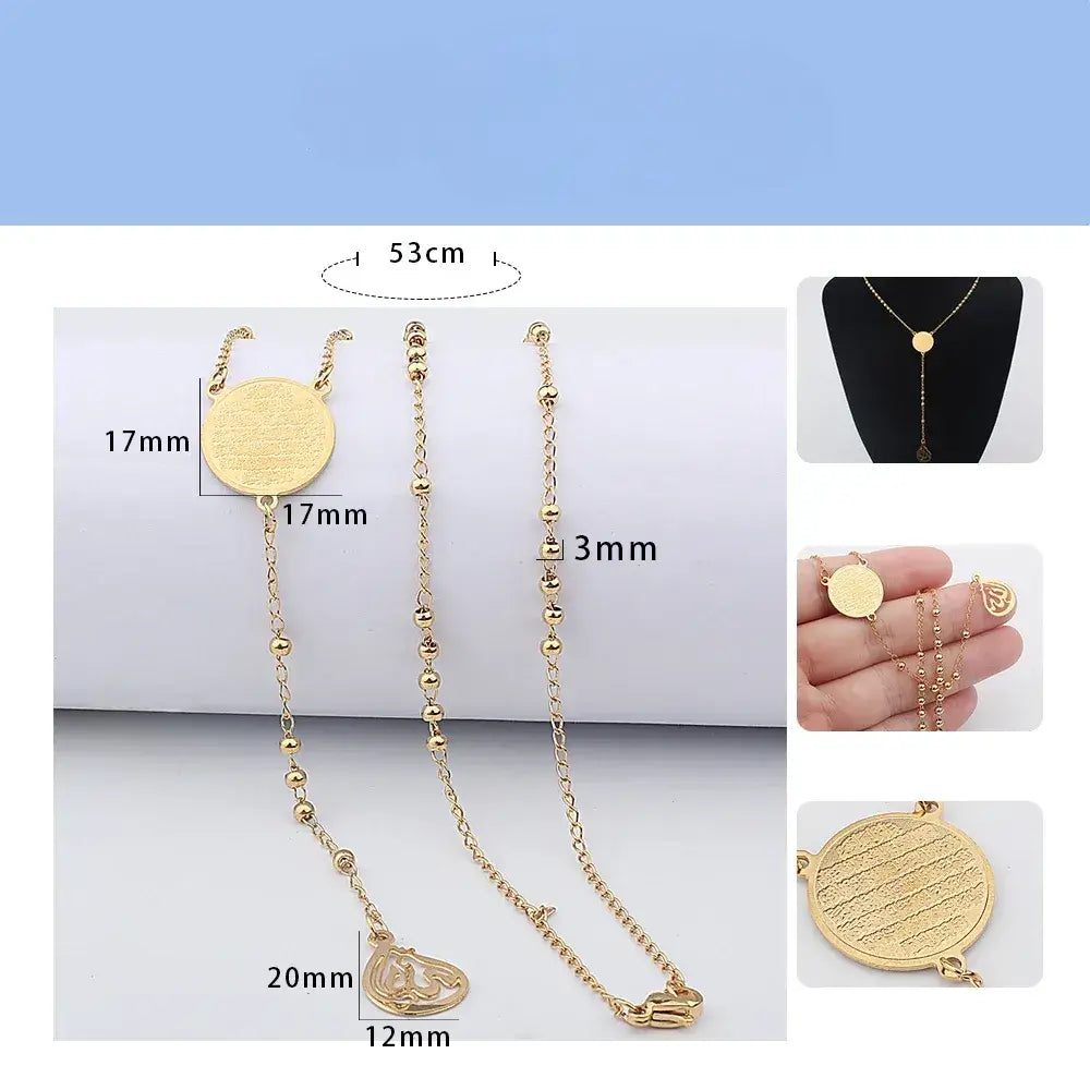 Laissez-vous transporter par la grâce et la dévotion avec notre collier pendentif « Harmonie Céleste » en acier inoxydable, orné d'une inscription arabe musulmane. Confectionné avec précision et soin, ce collier arbore une teinte dorée éclatante et de délicates perles de 3 mm, incarnant un charme intemporel. Au cœur de son design se trouve un pendentif finement gravé de versets arabes, faisant écho aux versets profonds du Coran et symbolisant la sérénité et l'harmonie divines.